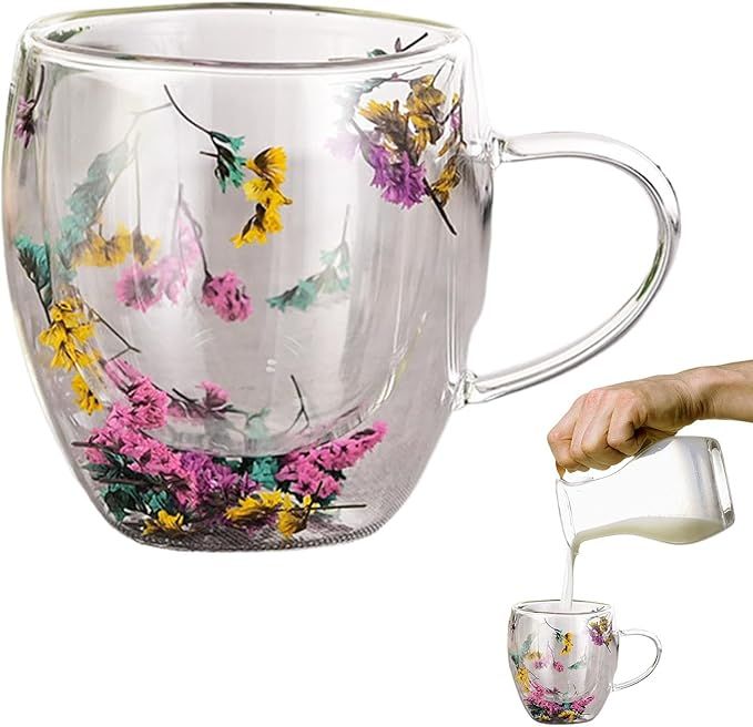 Double Walled Glass Coffee Mugs, Insulated Layer Flowers Coffee Cup, Demitasse Clear Cups with Colorful Crystal Flower, Perfect for Cappuccino Tea. (250 ml)